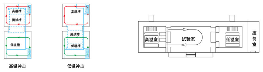 兩廂設(shè)備區(qū)分為高溫區(qū)和低溫區(qū)兩部分,測(cè)試產(chǎn)品置于提籃中,沖擊時(shí)提籃將測(cè)試產(chǎn)品 |